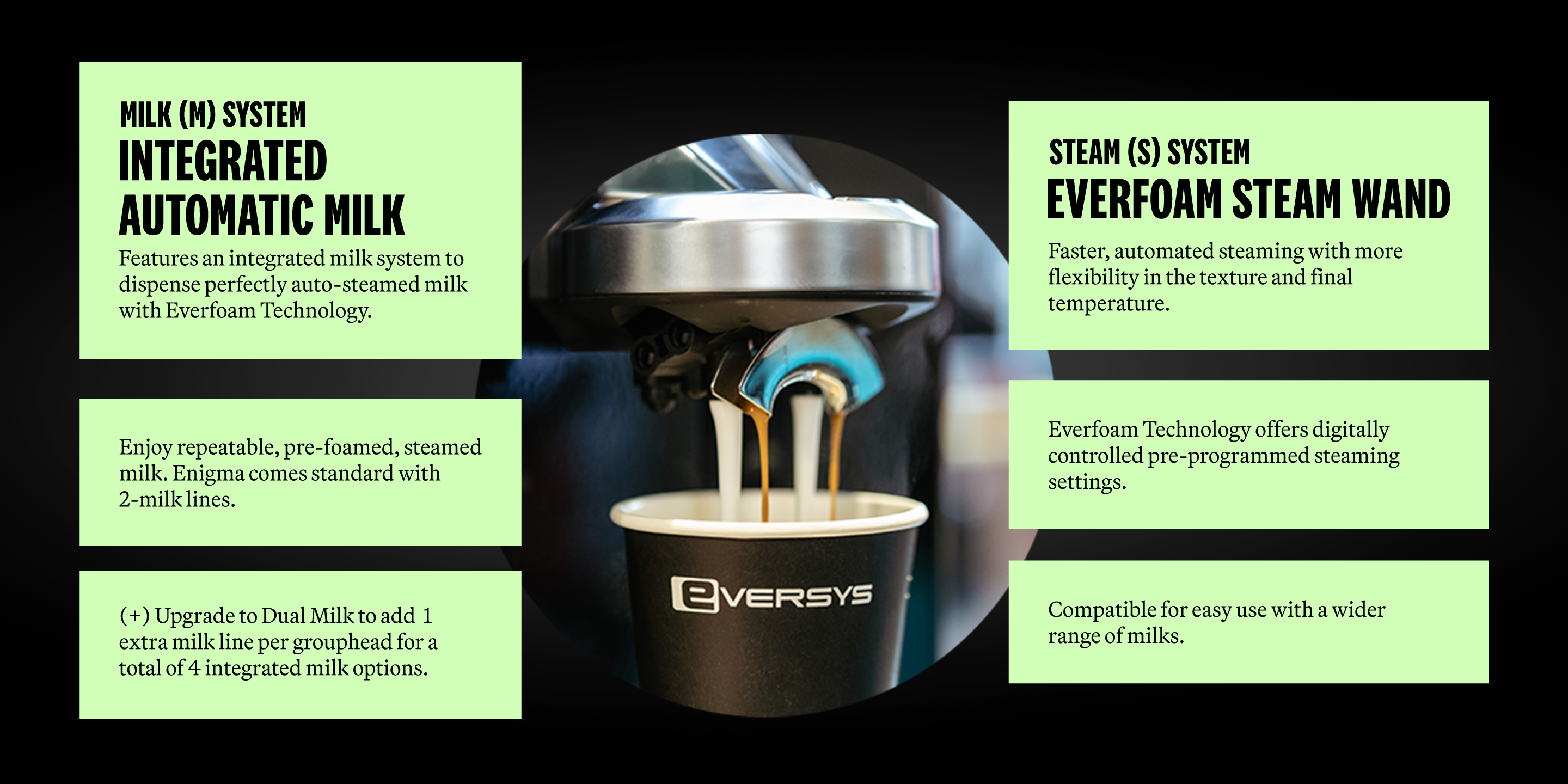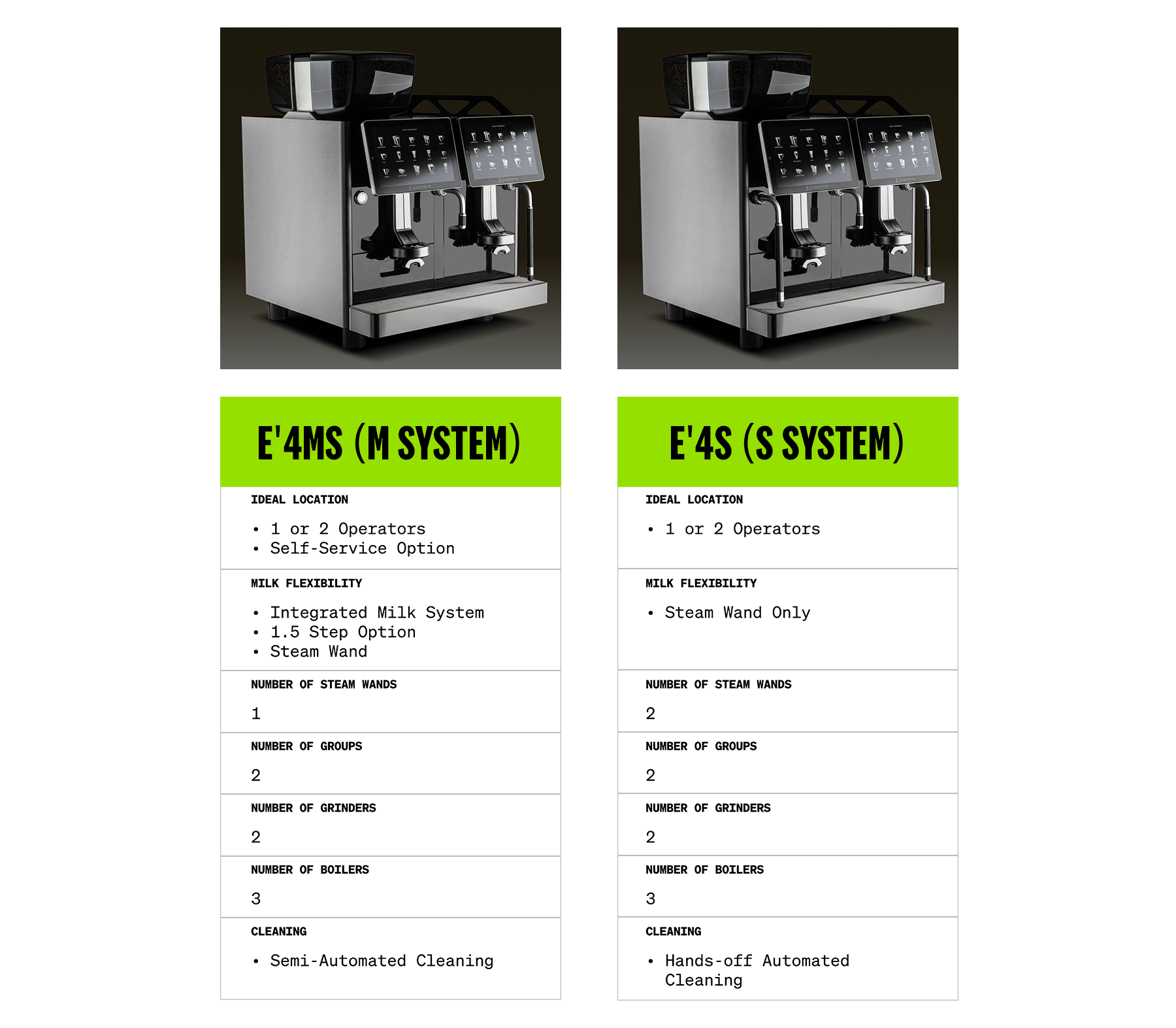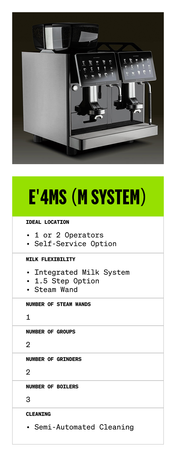 βΒ E4(M) X-Wide Upgrade adds (2) 1.5 Arms for pre-steamed milk