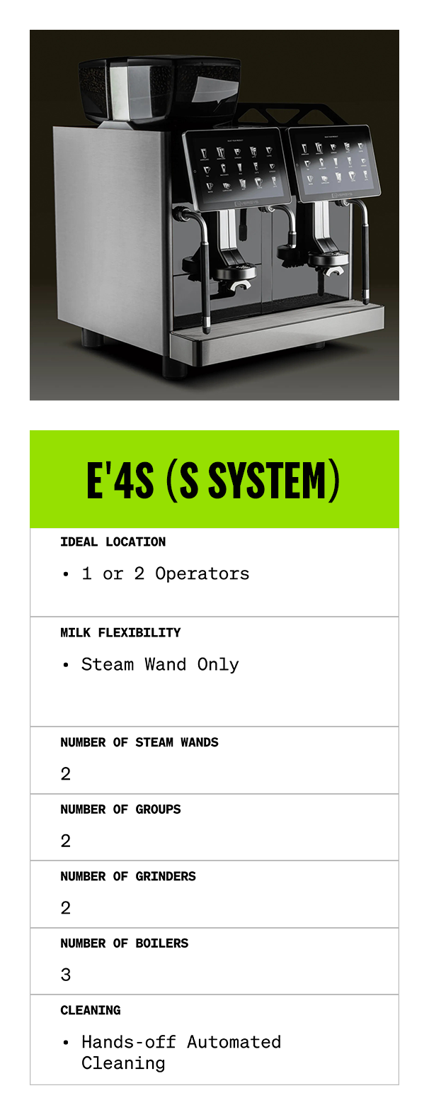 Expands the Eβ4s workspace so more than one barista can work comfortably. Features automated espresso, a hot water spout, and a steam wand for manual or automatic milk steaming in high-volume environments.